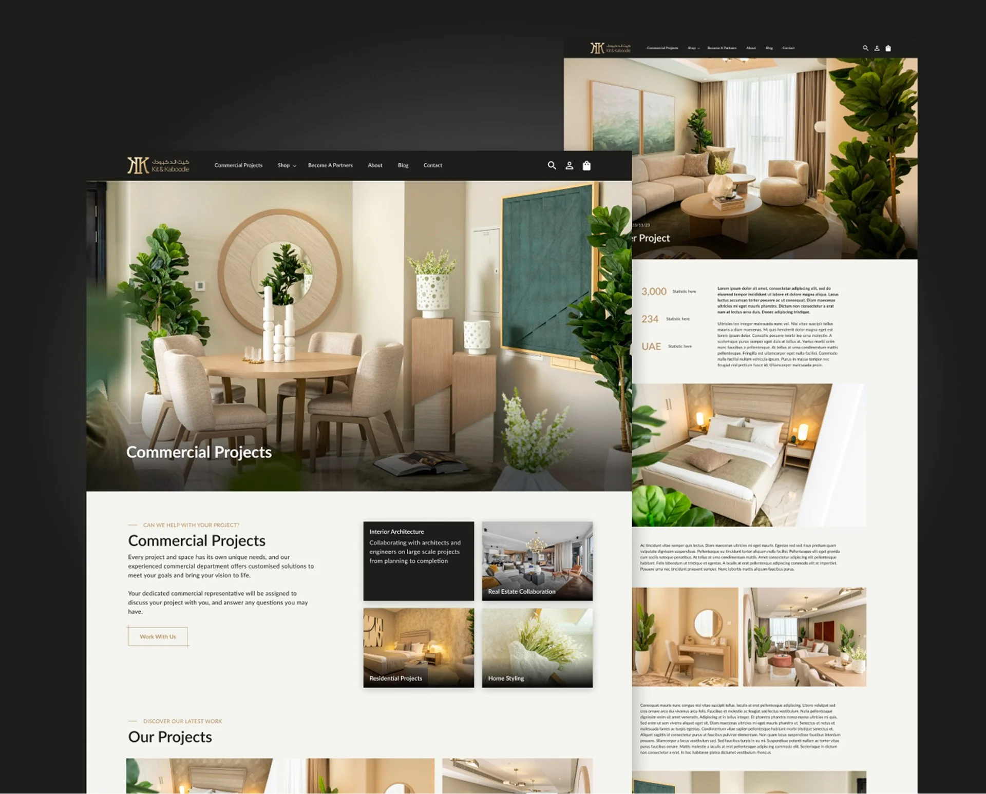 Kit&Kaboodle is a global furniture retailer expanding into e-commerce within the UAE. We redesigned and built a fully localised e-commerce website to showcase products and drive sales. The site was developed to showcase their residential and commercial work while driving both online sales and project enquiries. Working closely with cross-functional teams, we integrated inventory systems, sales workflows and CRM processes to deliver a high performing digital platform.