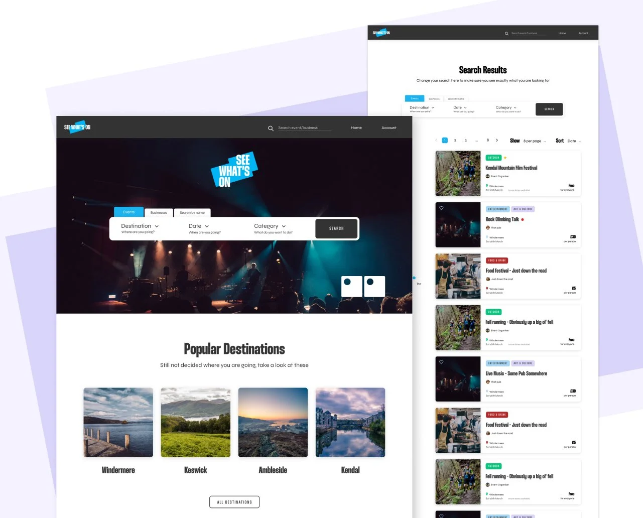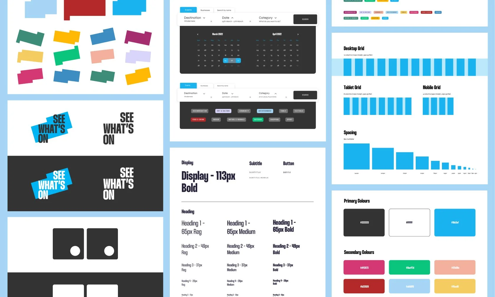 See What’s On is a new platform created to help Cumbrian businesses share their events and activities with ease, while giving locals and visitors a simple way to discover what’s happening across the region. The visual identity is built around the outline of a calendar month, forming a flexible graphic element that scales fluidly across the brand. The friendly brand mark takes inspiration from the daily grid of a calendar - a square representing each day and a circle marking an event - together forming a pair of eyes that reinforce the name and instantly draw attention to key information. Paired with a bold, playful typeface, the identity offers strong versatility for both digital and print applications, supporting a clear and engaging user experience.