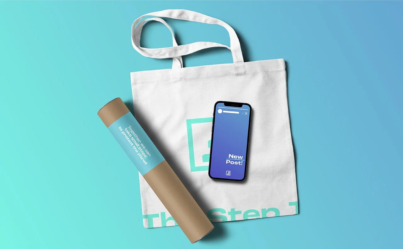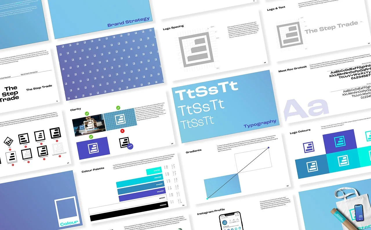 The Step Trade is a sustainable e-commerce platform designed to help people discover purposeful products and take their first steps toward a more conscious lifestyle. We developed a bold visual identity inspired by Scandinavian design and Piet Mondrian, centred around a punchy, scalable logo that reflects the idea of incremental progress. The supporting icon system, colour palette and typography were crafted to feel trustworthy, modern and digitally ready, with a vibrant turquoise accent used to highlight key information. A strong and cohesive foundation for a brand ready to grow.