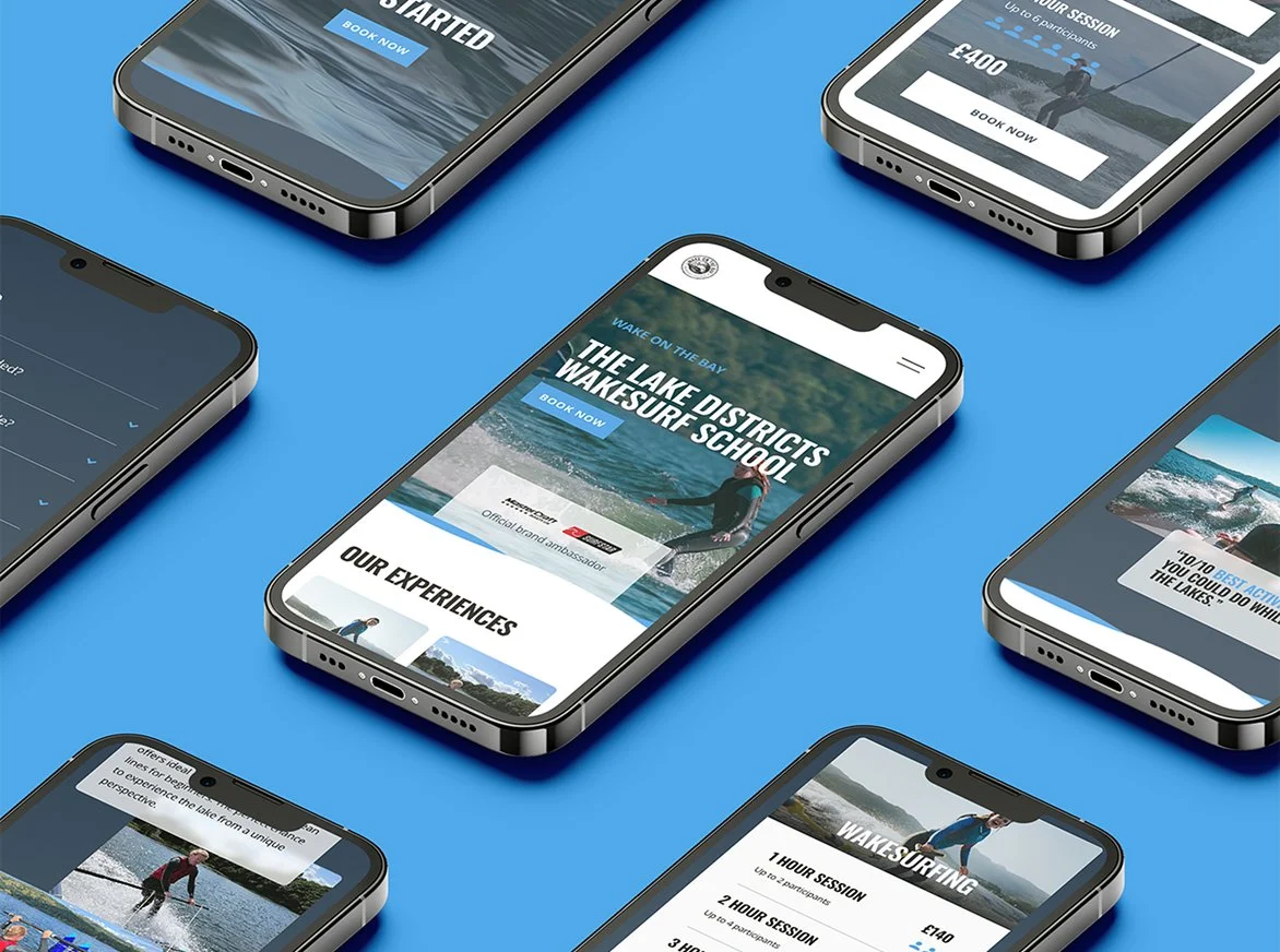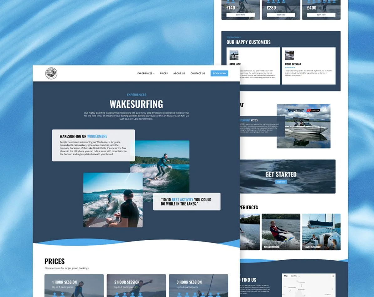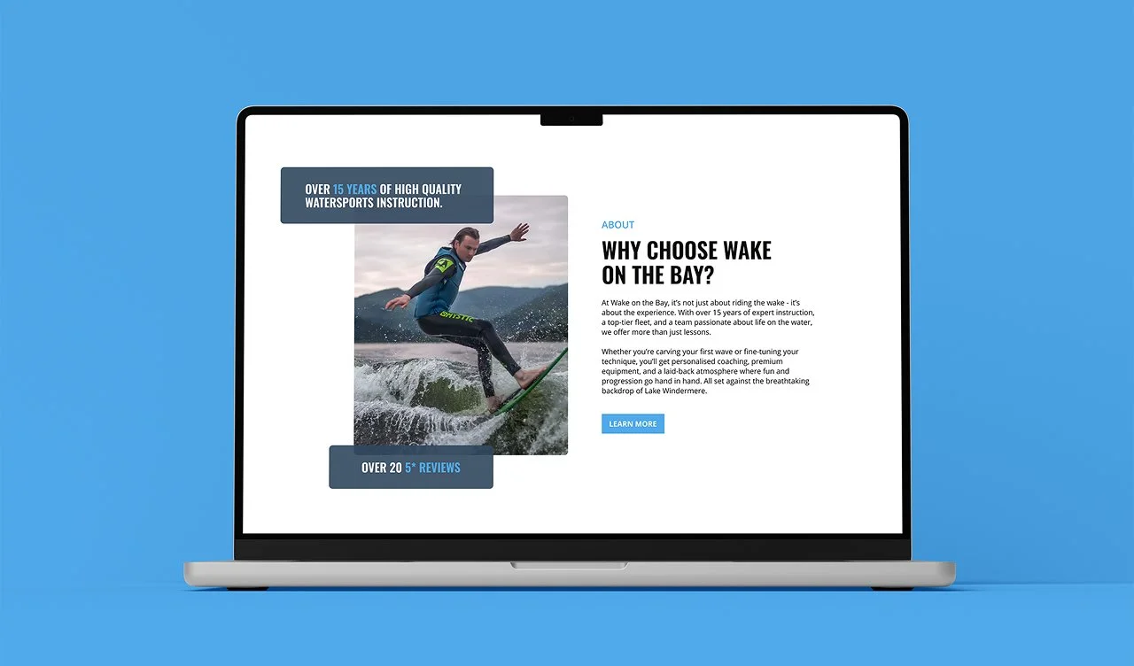 Based on Lake Windermere, Wake On The Bay offers tailored watersport experiences. For this project we redesigned and rebuilt their website from the ground up, beginning with a digital design system to strengthen visual consistency and brand personality. The new experience prioritises clear user journeys, making pricing, activities, reviews and essential information easier to find and digest. Dynamic visuals, structured content and an intuitive layout work together to inspire confidence and excitement, and ultimately drive more enquiries and bookings.
